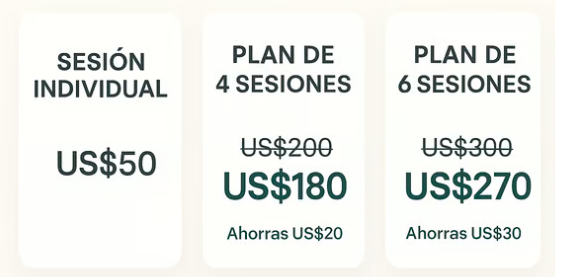 Cada sesión tiene un valor de 50 dólares. Hay descuentos si compras 4 u 6 sesiones en un solo pago. Se aceptan pagos por Wise y PayPal.